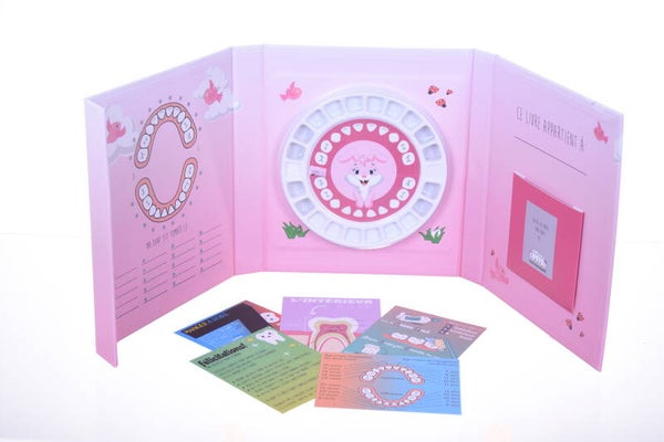 Le livret se compose d’un support pratique avec des compartiments tournants où chaque dent a sa propre place. Il y a de la place pour une photo et avec chaque dent, vous pouvez garder une trace du moment où elle a été changée. De plus, ce livret contient cinq cartes spéciales renouvelées avec des faits amusants et importants que votre dentiste trouve importants à connaître.