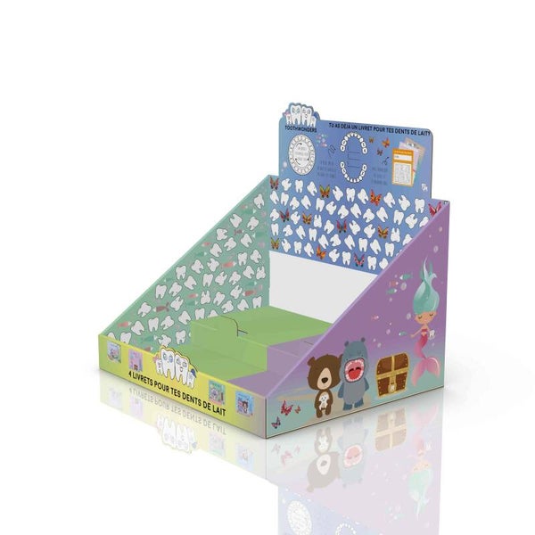 An eye-catching display to make the French tooth booklets stand out even better in the store and to catch the attention of your customers.